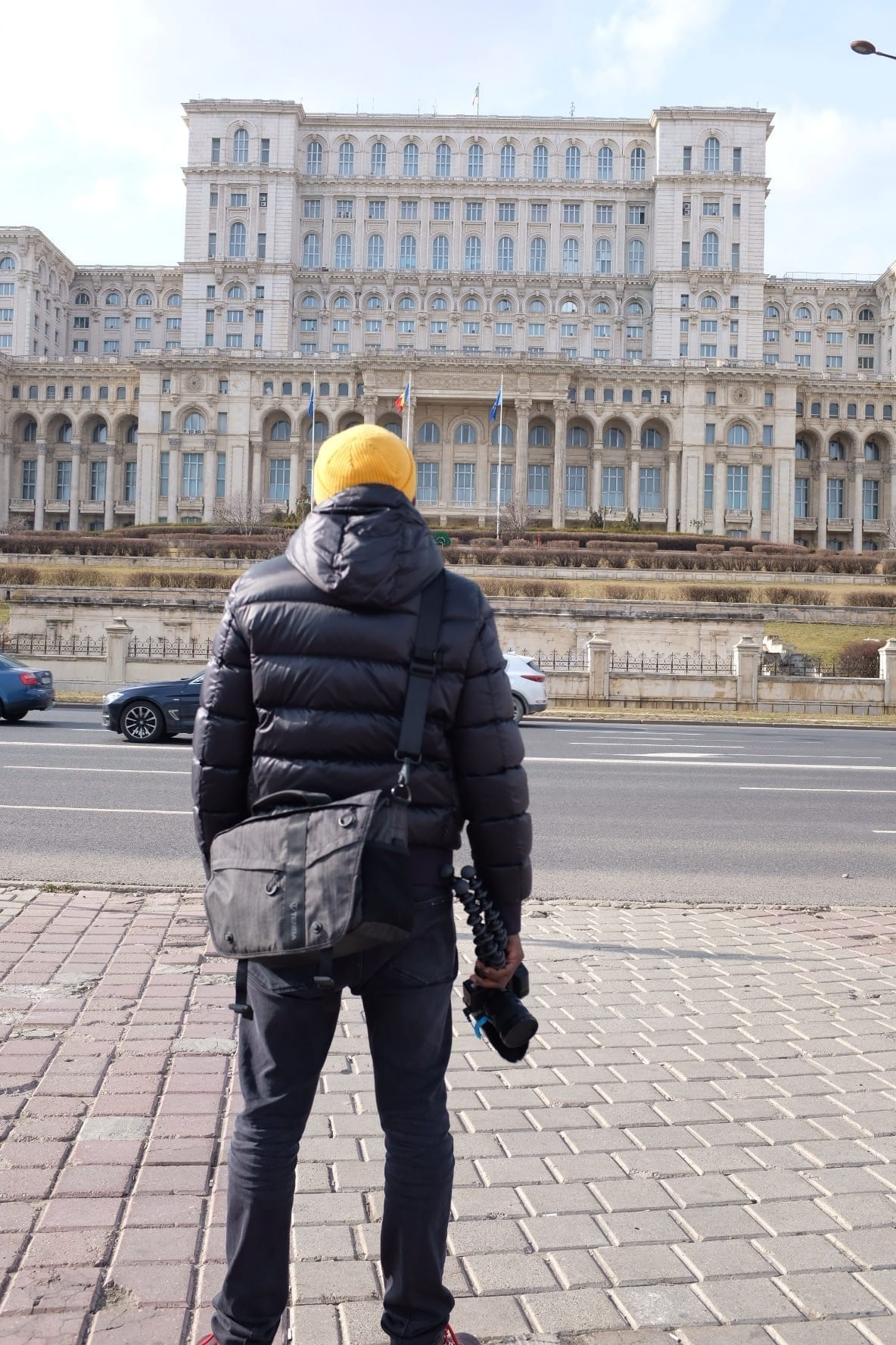 Look at him – warm and cozy. Standing at attention in front of brutalist Romanian architecture.